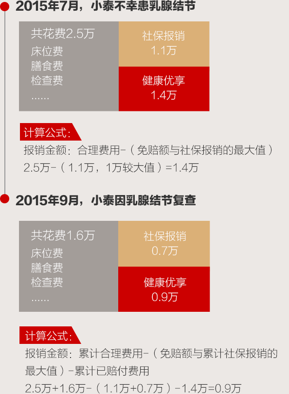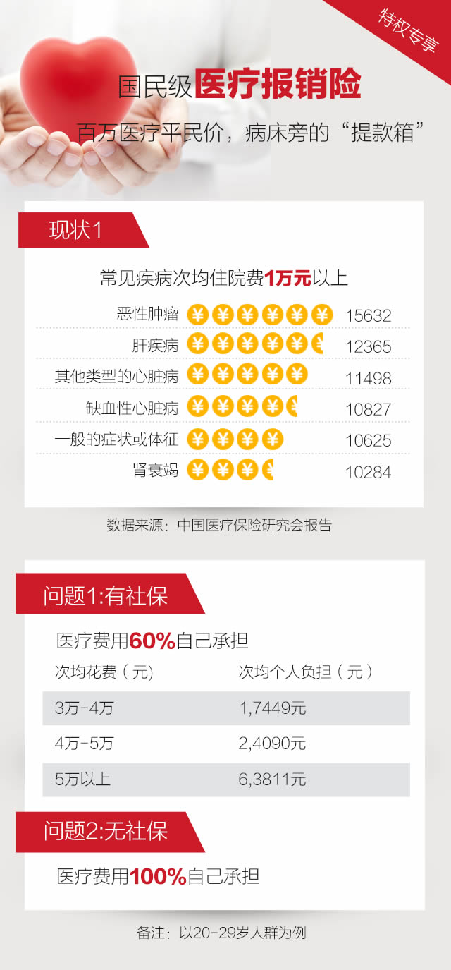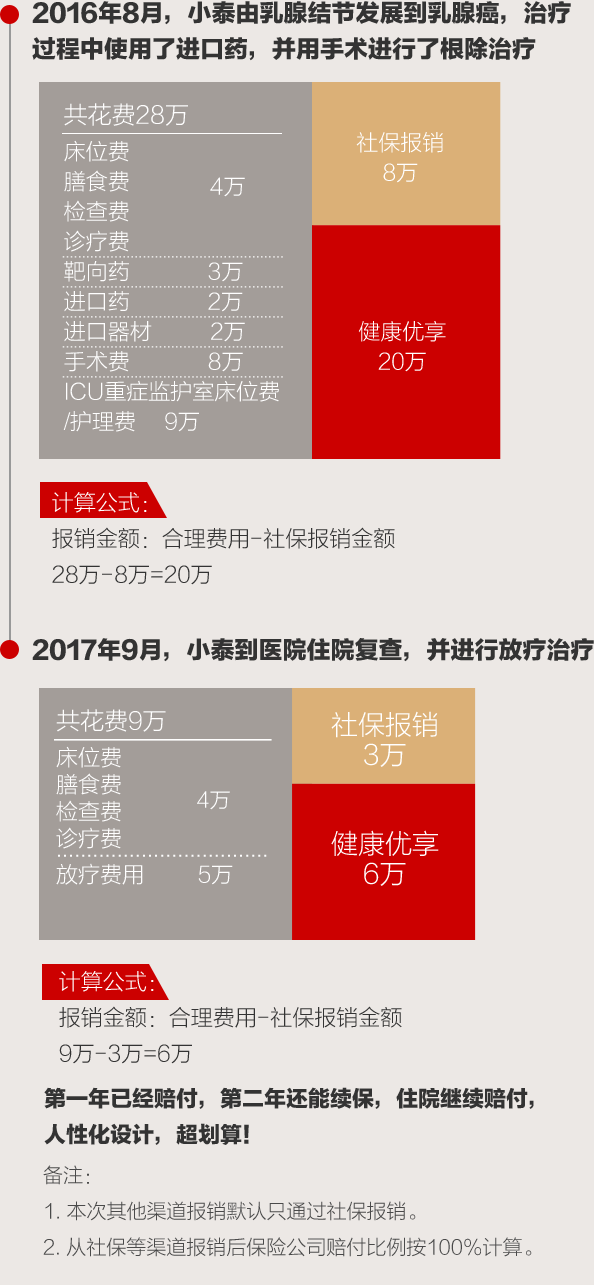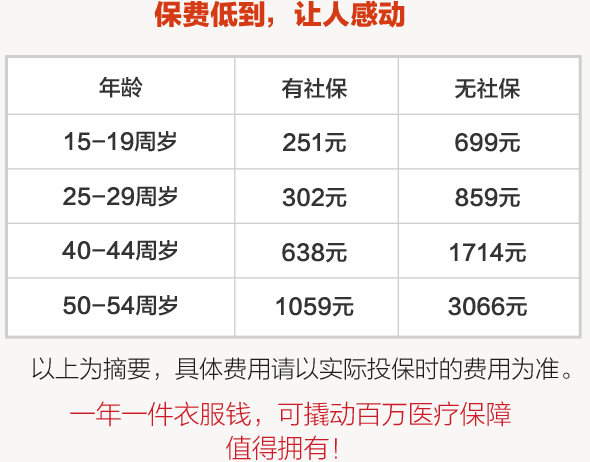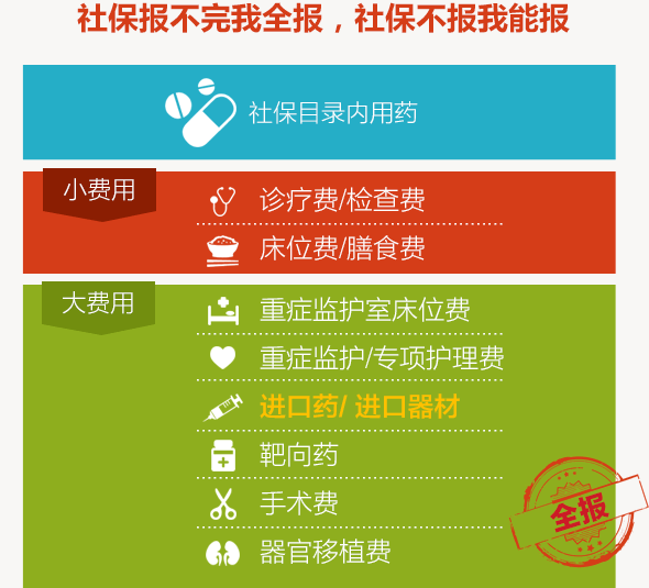 | 保险责任 | 床位费和膳食费、重症监护室床位费、药品费、材料费、医生费(诊疗费)、治疗费、护理费、检查化验费、手术费用、器官移植费 | 床位费和膳食费、重症监护室床位费、药品费、材料费、医生费(诊疗费)、治疗费、护理费、检查化验费、手术费用、器官移植费 |